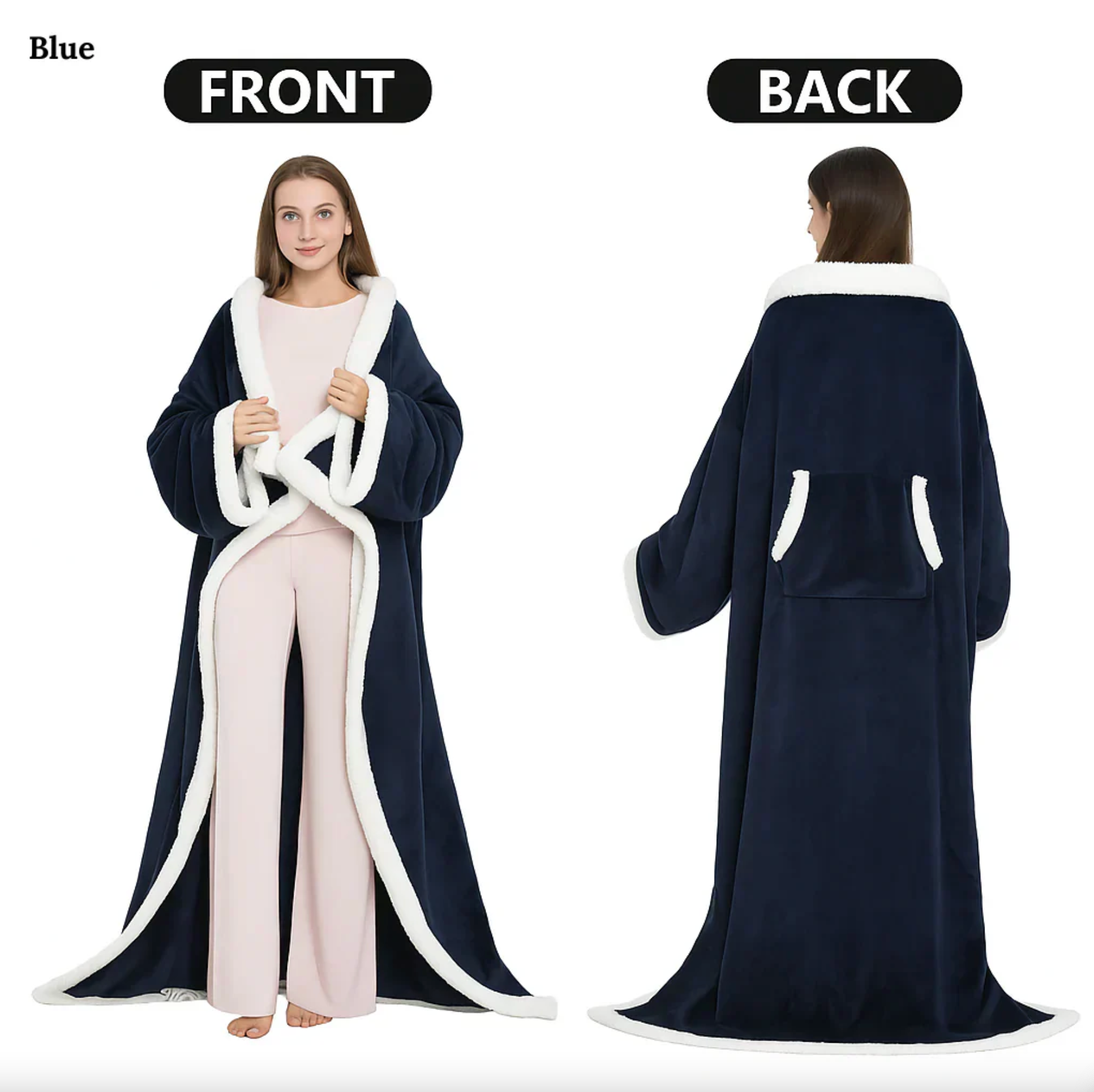 The HeatHug Blanket™ is a wearable one-size design (151–180 cm length, 111–140 cm width), roomy enough to fit most adults comfortably whether on the couch, recliner, or bed.